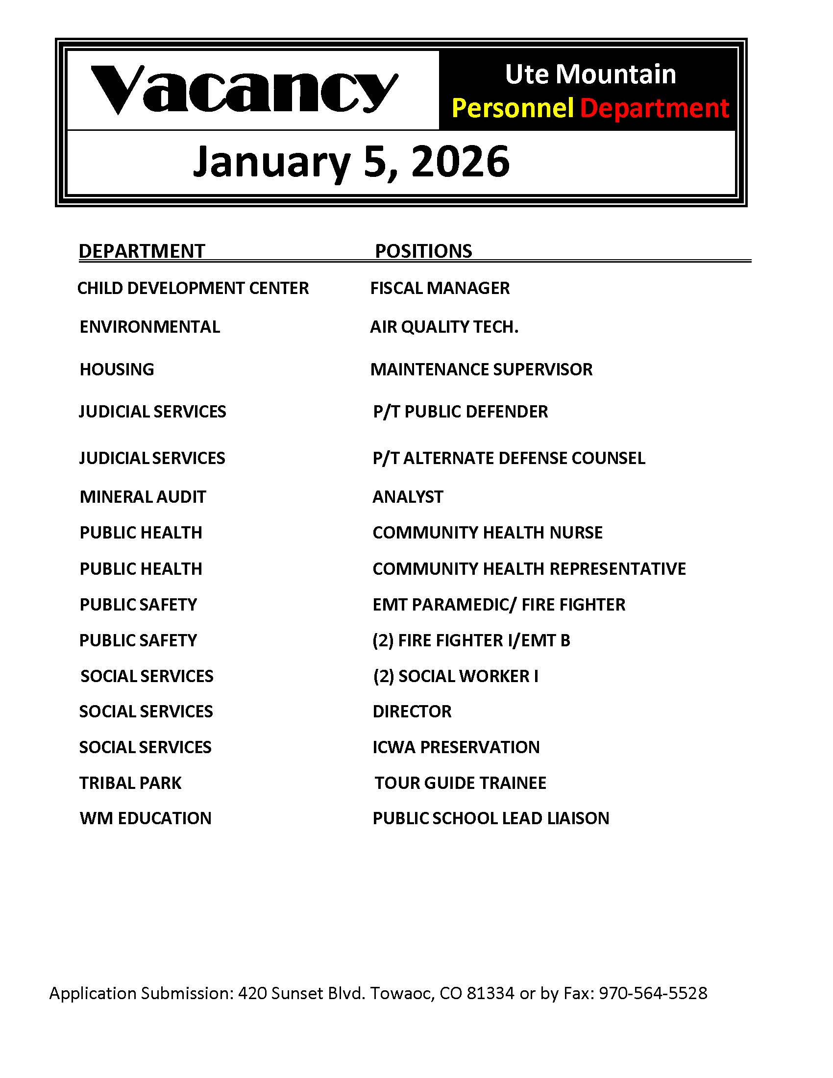 Note: We are an Equal Employment Opportunity employer however Ute Mountain is a Sovereign Nation...and we elect to practice our sovereign rights therefore we utilize TRIBAL PREFERENCE.
