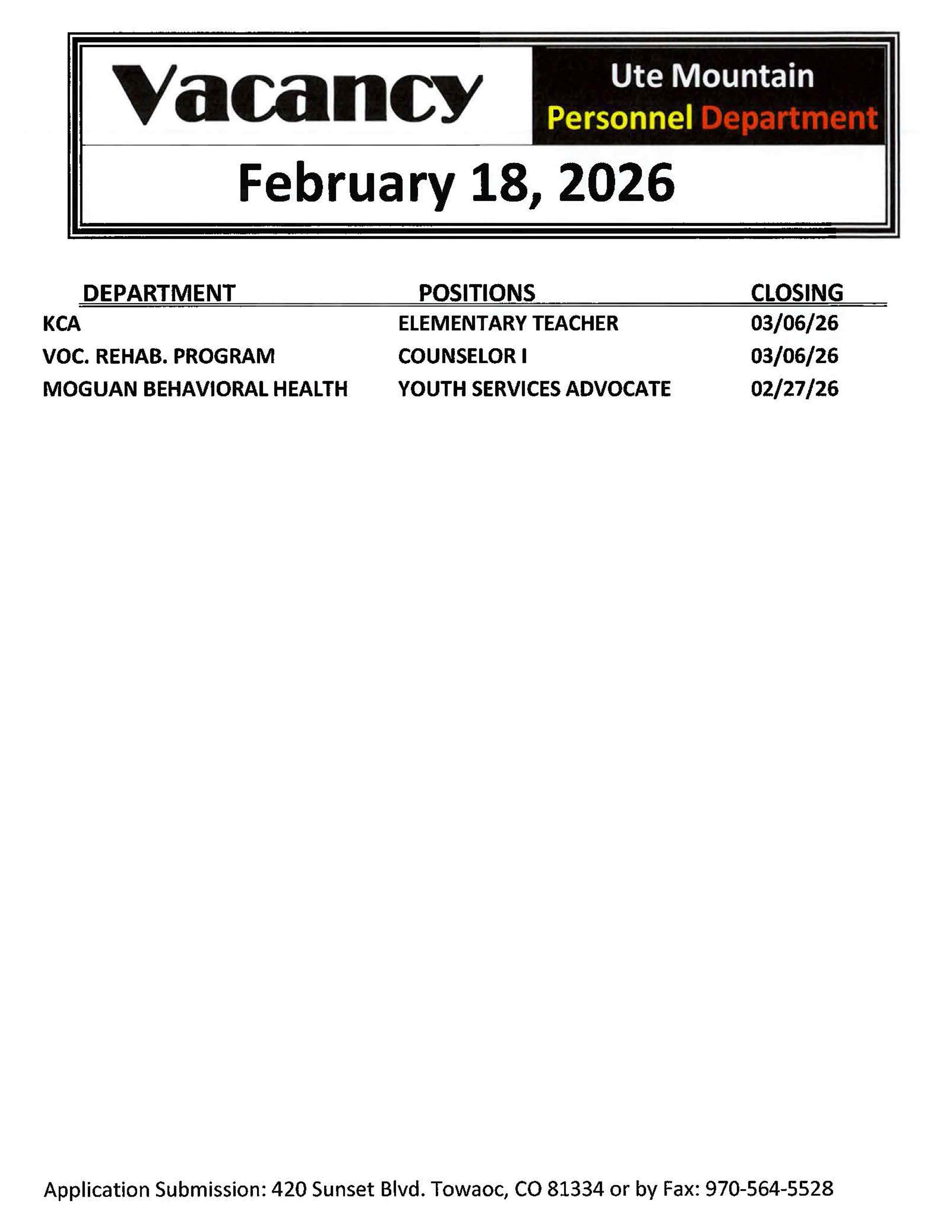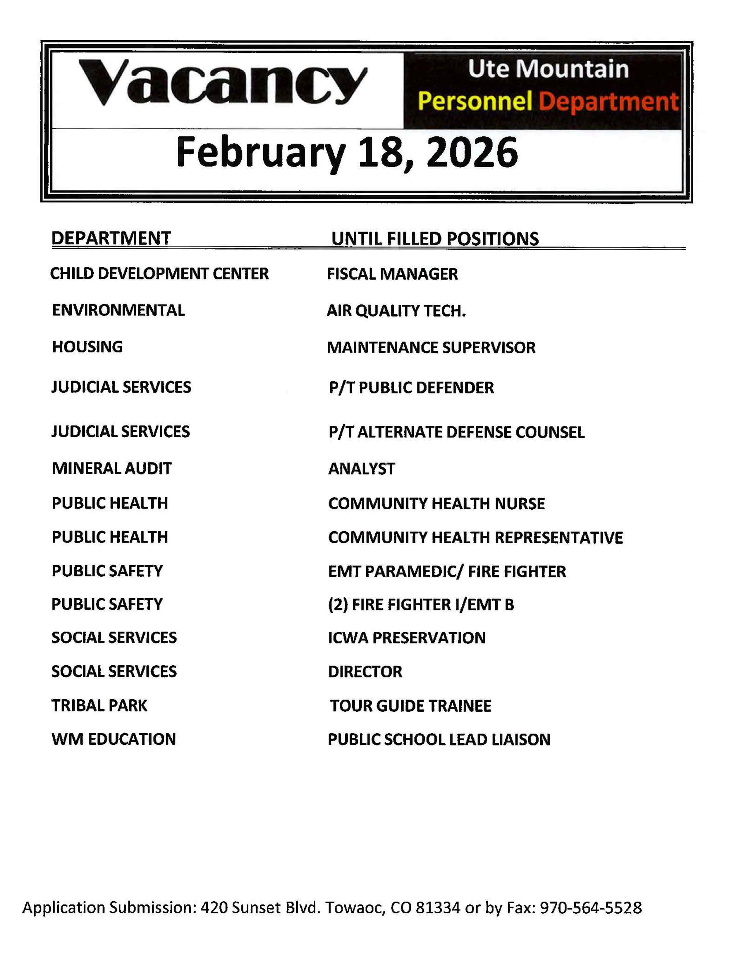 Note: We are an Equal Employment Opportunity employer however Ute Mountain is a Sovereign Nation...and we elect to practice our sovereign rights therefore we utilize TRIBAL PREFERENCE.